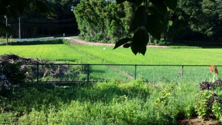 2015.7.14.と15. 梅雨の前に草取りしたのに、梅雨の間にものすごい勢いで雑草オンパレード。 草刈りしながら、ふと見渡すと、目の前の田甫に2羽の白鷺と1羽のグレーの白鷺が、美しかった。 稲の緑も素敵でした。
